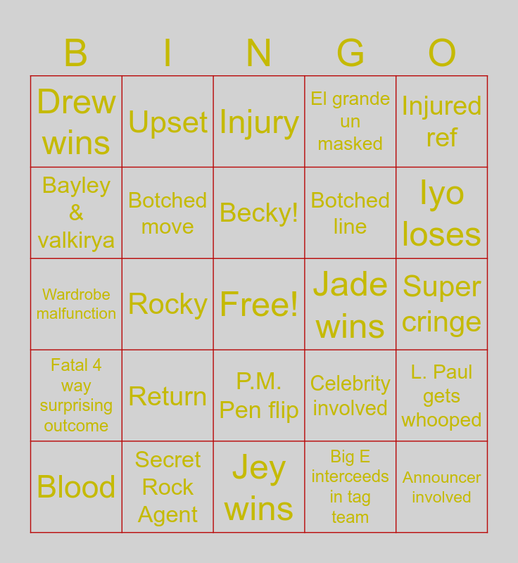 This bingo card has a free space and 24 words: Return, Secret Rock Agent, Becky!, Blood, Injured ref, Drew wins, Bayley & valkirya, Upset, Jade wins, P.M. Pen flip, Botched line, Wardrobe malfunction, Celebrity involved, L. Paul gets whooped, Botched move, Big E interceeds in tag team, Super cringe, Injury, Iyo loses, Rocky, Announcer involved, Fatal 4 way surprising outcome, El grande un masked and Jey wins.