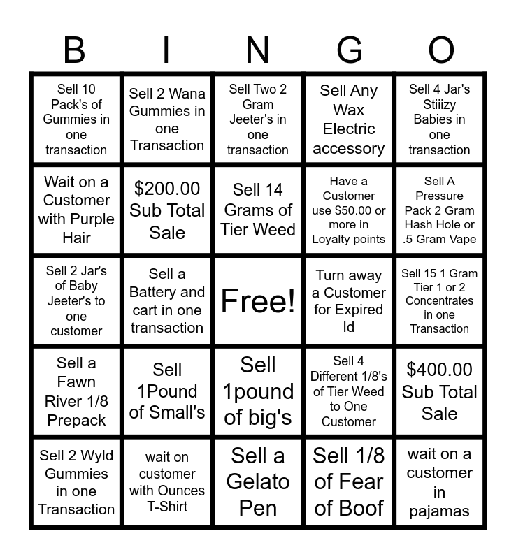 This bingo card has a free space and 24 words: Sell 1Pound of Small's, wait on customer with Ounces T-Shirt, Sell 14 Grams of Tier Weed, Sell 2 Wyld Gummies in one Transaction, Sell 4 Jar's Stiiizy Babies in one transaction, Sell 10 Pack's of Gummies in one transaction, Wait on a Customer with Purple Hair, Sell 2 Wana Gummies in one Transaction, Turn away a Customer for Expired Id, Sell 1pound of big's, Have a Customer use $50.00 or more in Loyalty points, Sell 2 Jar's of Baby Jeeter's to one customer, Sell 4 Different 1/8's of Tier Weed to One Customer, $400.00 Sub Total Sale, $200.00 Sub Total Sale, Sell 1/8 of Fear of Boof, Sell 15 1 Gram Tier 1 or 2 Concentrates in one Transaction, Sell Two 2 Gram Jeeter's in one transaction, Sell A Pressure Pack 2 Gram Hash Hole or .5 Gram Vape, Sell a Battery and cart in one transaction, wait on a customer in pajamas, Sell a Fawn River 1/8 Prepack, Sell Any Wax Electric accessory and Sell a Gelato Pen.