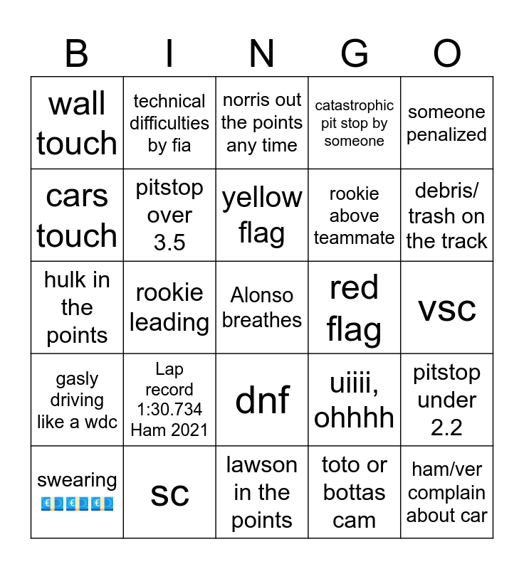 This bingo card has a free space and 24 words: Lap record 1:30.734 Ham 2021, sc, yellow flag, swearing ๐ถ๐ถ๐ถ, someone penalized, wall touch, cars touch, technical difficulties by fia, red flag, dnf, rookie above teammate, hulk in the points, uiiii, ohhhh, pitstop under 2.2, pitstop over 3.5, toto or bottas cam, vsc, norris out the points any time, debris/ trash on the track, rookie leading, ham/ver complain about car, gasly driving like a wdc, catastrophic pit stop by someone and lawson in the points.