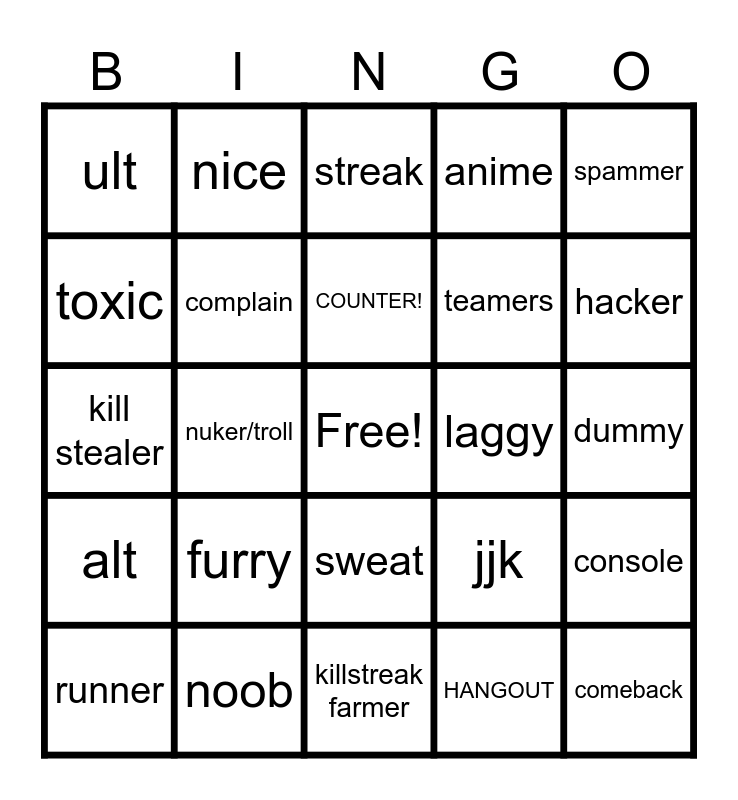 This bingo card has a free space and 24 words: furry, noob, COUNTER!, runner, spammer, ult, toxic, nice, laggy, sweat, teamers, kill stealer, jjk, console, complain, HANGOUT, dummy, streak, hacker, nuker/troll, comeback, alt, anime and killstreak farmer.