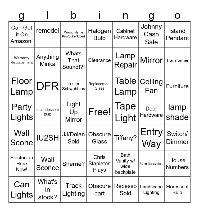 This bingo card has a free space and 48 words: Bath Vanity w/ wide backplate, Mirror, Obscure part, Incandescent bulb, Lester Schwabbins, lamp shade, remodel, What's in stock?, Johnny Cash Sale, Obscure Glass, Island Pendant, Halogen Bulb, Ceiling Fan, Table Lamp, Electrician Here Now!, Door Hardware, Warranty Replacement, Transformer, Undercabs, Cabinet Hardware, Lamp Repair, Light Up Mirror, Can Get It On Amazon!, Anything Minka, House Numbers, Whats That Sound!?!, Furniture, Can Lights, Replacement Glass, DFR, Landscape Lighting, Tape Light, Switch/ Dimmer, Wall Sconce, Party Lights, Tiffany?, Entry Way, Floor Lamp, JJ/Dolan Sold, Sherrie?, Wall Scone, Florescent Bulb, Wrong Name Kim/Luke/Albert, Track Lighting, Clearance, Chris Stapleton Plays, IU2SH and Recesso Sold.