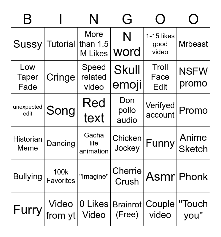 This bingo card has 36 words: Cherrie Crush, ''Imagine'', Brainrot (Free), Low Taper Fade, Historian Meme, Don pollo audio, Cringe, 0 Likes Video, 1-15 likes good video, Asmr, NSFW promo, N word, Phonk, Song, Skull emoji, Sussy, Bullying, Verifyed account, unexpected edit, More than 1.5 M Likes, Red text, Dancing, Chicken Jockey, Gacha life animation, Funny, Tutorial, Troll Face Edit, Video from yt, Speed related video, Mrbeast, ''Touch you'', Furry, Anime Sketch, Promo, 100k Favorites and Couple video.