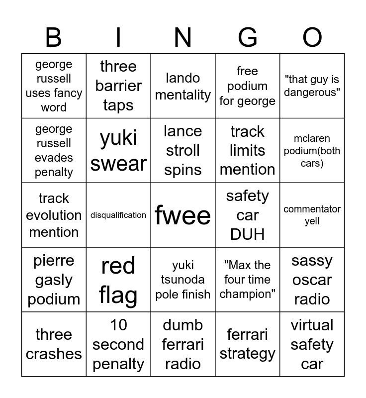 This bingo card has a free space and 24 words: red flag, 10 second penalty, lance stroll spins, three crashes, "that guy is dangerous", george russell uses fancy word, george russell evades penalty, three barrier taps, safety car DUH, yuki tsunoda pole finish, track limits mention, track evolution mention, "Max the four time champion", sassy oscar radio, yuki swear, ferrari strategy, commentator yell, lando mentality, mclaren podium(both cars), disqualification, virtual safety car, pierre gasly podium, free podium for george and dumb ferrari radio.