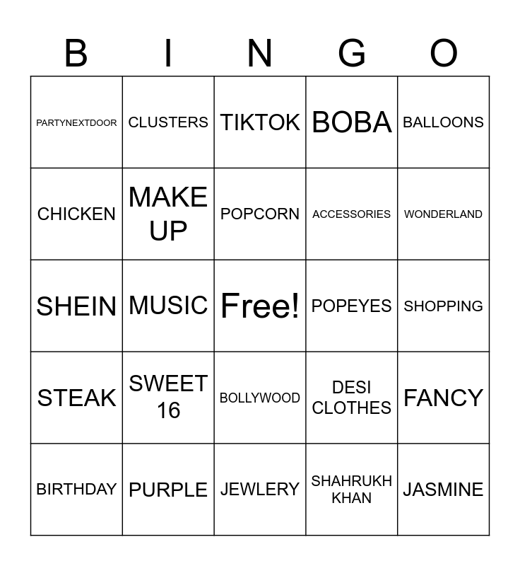 This bingo card has a free space and 24 words: SWEET 16, PURPLE, POPCORN, BIRTHDAY, BALLOONS, PARTYNEXTDOOR, CHICKEN, CLUSTERS, POPEYES, BOLLYWOOD, ACCESSORIES, SHEIN, DESI CLOTHES, FANCY, MAKE UP, SHAHRUKH KHAN, SHOPPING, TIKTOK, WONDERLAND, MUSIC, JASMINE, STEAK, BOBA and JEWLERY.