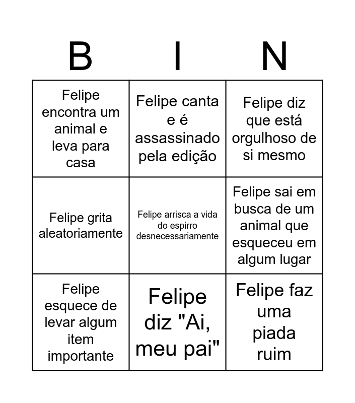 This bingo card has a free space and 8 words: Felipe sai em busca de um animal que esqueceu em algum lugar, Felipe diz que está orgulhoso de si mesmo, Felipe canta e é assassinado pela edição, Felipe esquece de levar algum item importante, Felipe encontra um animal e leva para casa, Felipe faz uma piada ruim, Felipe grita aleatoriamente and Felipe diz "Ai, meu pai".