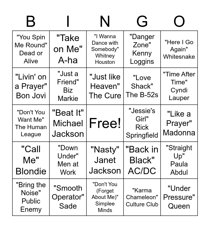 This bingo card has a free space and 29 words: "Bring the Noise" Public Enemy, "Crazy Train" Ozzy Osbourne, "Beat It" Michael Jackson, "Our Lips Are Sealed" The Go-Gos, "You Spin Me Round" Dead or Alive, "I Wanna Dance with Somebody" Whitney Houston, "Just a Friend" Biz Markie, "Down Under" Men at Work, "Jessie's Girl" Rick Springfield, "Smooth Operator" Sade, "Like a Prayer" Madonna, "Under Pressure" Queen, "Don't You (Forget About Me)" Simplee Minds, "Karma Chameleon" Culture Club, "Time After Time" Cyndi Lauper, "Running Up That Hill" Kate Bush, "Nasty" Janet Jackson, "Call Me" Blondie, "Here I Go Again" Whitesnake, "Don't You Want Me" The Human League, "Back in Black" AC/DC, "Push It" Salt-N-Pepa, "Love Shack" The B-52s, "Livin' on a Prayer" Bon Jovi, "Danger Zone" Kenny Loggins, "Take on Me" A-ha, "Straight Up" Paula Abdul, "Just like Heaven" The Cure and "Kiss" Prince.