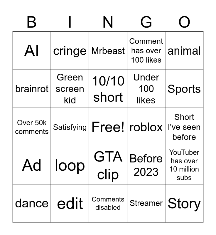 This bingo card has a free space and 24 words: loop, edit, 10/10 short, dance, animal, AI, brainrot, cringe, roblox, GTA clip, Under 100 likes, Over 50k comments, Before 2023, YouTuber has over 10 million subs, Green screen kid, Streamer, Short I've seen before, Mrbeast, Sports, Satisfying, Story, Ad, Comment has over 100 likes and Comments disabled.