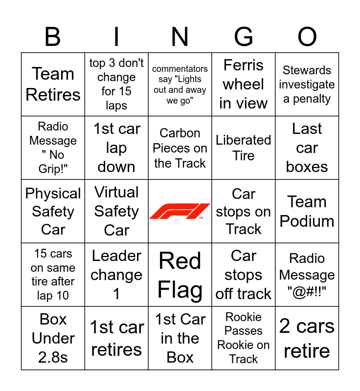 This bingo card has a free space and 30 words: 1st car retires, 6 Teams in top 10, Virtual Safety Car, Bad pit over 4 sec., Team Retires, commentators say "Lights out and away we go", 1st car lap down, Red Flag, Car stops on Track, 1st Car in the Box, Team Podium, 2 cars retire, Rookie Passes Rookie on Track, Spin to Win (Car spins 360 & Continues), Last car boxes, Nose Job in the Box, Car stops off track, 15 cars on same tire after lap 10, Leader change 1, Stewards investigate a penalty, Physical Safety Car, Yellow Flag, top 3 don't change for 15 laps, Liberated Tire, Radio Message " No Grip!", Ferris wheel in view, Radio Message "@#!!", Box Under 2.8s, Carbon Pieces on the Track and Leader change 2.