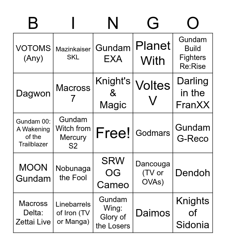 This bingo card has a free space and 24 words: Nobunaga the Fool, Linebarrels of Iron (TV or Manga), Knight's & Magic, Macross Delta: Zettai Live, Gundam Build Fighters Re:Rise, VOTOMS (Any), Dagwon, Mazinkaiser SKL, Godmars, SRW OG Cameo, Voltes V, Gundam 00: A Wakening of the Trailblazer, Dancouga (TV or OVAs), Dendoh, Macross 7, Daimos, Gundam G-Reco, Gundam EXA, Darling in the FranXX, Gundam Witch from Mercury S2, Knights of Sidonia, MOON Gundam, Planet With and Gundam Wing: Glory of the Losers.