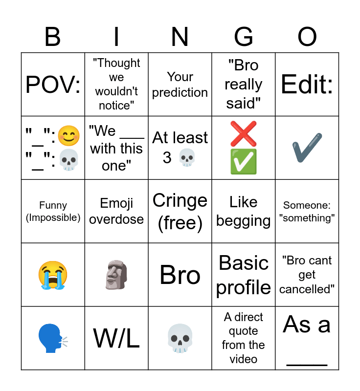 This bingo card has a free space and 29 words: 🗣️, "[Bro] really", Emoji overdose, "___ Got me dying", POV:, Your prediction, "We ___ with this one", 🗿, Like begging, W/L, Someone: "something", As a ___, 💀, A direct quote from the video, ✔️, At least 2 comments saying the same thing, Bro, 😭, Edit:, Funny (Impossible), Basic profile, "Truly a ___ moment", ❌ ✅, "_":😊 "_":💀, "Bro really said", "Thought we wouldn't notice", "Bro cant get cancelled", At least 3 💀 and At least 3 comments with "__".