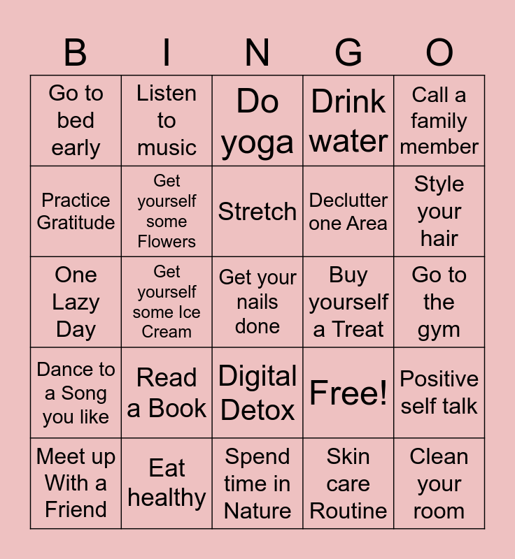 This bingo card has 25 words: Read a Book, Spend time in Nature, Stretch, Meet up With a Friend, Call a family member, Go to bed early, Practice Gratitude, Listen to music, Buy yourself a Treat, Digital Detox, Declutter one Area, One Lazy Day, Free!, Positive self talk, Get yourself some Flowers, Clean your room, Go to the gym, Do yoga, Style your hair, Get yourself some Ice Cream, Get your nails done, Eat healthy, Dance to a Song you like, Drink water and Skin care Routine.