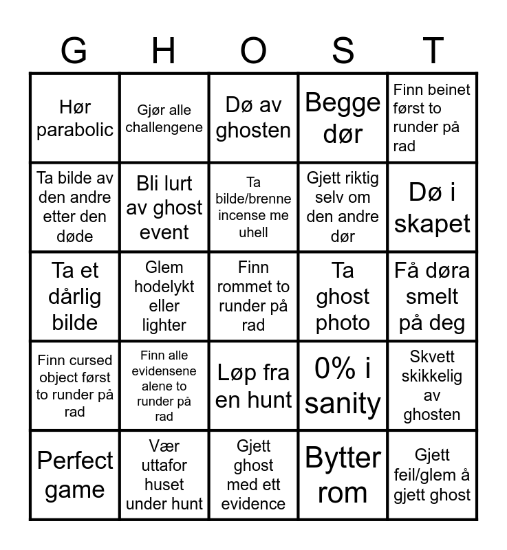 This bingo card has 25 words: Finn cursed object først to runder på rad, Vær uttafor huset under hunt, Finn rommet to runder på rad, Bytter rom, Finn beinet først to runder på rad, Hør parabolic, Gjør alle challengene, Dø av ghosten, Ta ghost photo, Skvett skikkelig av ghosten, Ta bilde av den andre etter den døde, Bli lurt av ghost event, Gjett ghost med ett evidence, 0% i sanity, Dø i skapet, Perfect game, Glem hodelykt eller lighter, Ta bilde/brenne incense me uhell, Gjett riktig selv om den andre dør, Få døra smelt på deg, Ta et dårlig bilde, Finn alle evidensene alene to runder på rad, Løp fra en hunt, Begge dør and Gjett feil/glem å gjett ghost.