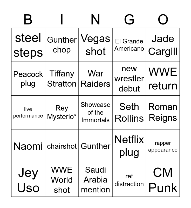 This bingo card has a free space and 39 words: LA Knight, Jacob Fatu, Charlotte Flair, Tiffany Stratton, Jey Uso, Gunther, War Raiders, New Day, Jade Cargill, Naomi, Rey Mysterio*, El Grande Americano, CM Punk, Roman Reigns, Seth Rollins, chairshot, announce table, steel steps, ref bump, Netflix plug, Peacock plug, Saudi Arabia mention, new wrestler debut, WWE return, moonsault, hurricanrana, DDT, suicide dive, superkick, Gunther chop, submission, face/heel turn, Vegas shot, WWE World shot, ref distraction, legend appearance, rapper appearance, live performance and entrance pyro.