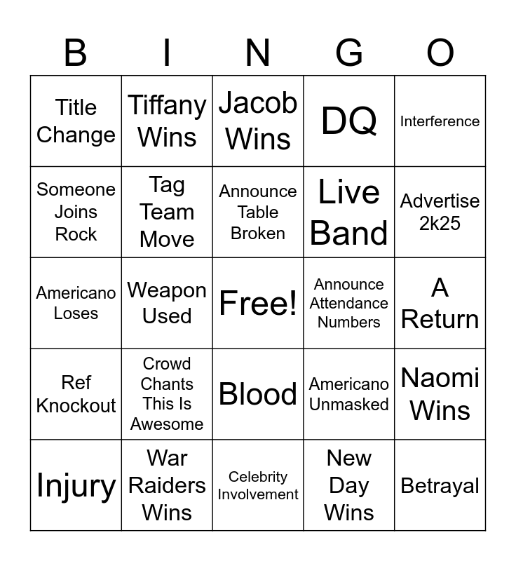 This bingo card has a free space and 39 words: Submission Finish, Super Finisher, Use Opponent’s Finisher, Tag Team Move, Injury, Blood, Announce Table Broken, Hydration Station Spot, Interference, Ref Knockout, Weapon Used, DQ, Betrayal, A Return, Announce Attendance Numbers, Crowd Chants This Is Awesome, HHH Comes out, Title Change, No Title Change, Americano Unmasked, Someone Joins Rock, Celebrity Involvement, Live Band, Advertise 2k25, CM Punks Wins, Seth Wins, Roman Wins, Jey Wins, Gunther Wins, Tiffany Wins, Charlotte Wins, LA Knight Wins, Jacob Wins, War Raiders Wins, New Day Wins, Jade Wins, Naomi Wins, Americano Loses and Americano Wins.