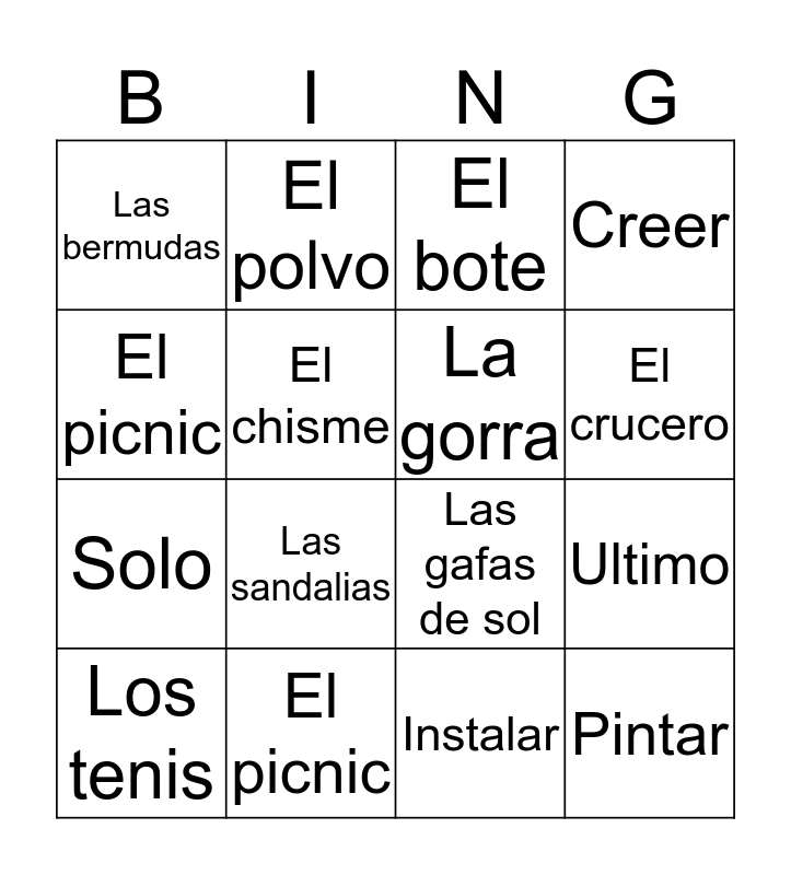This bingo card has a free space and 15 words: Los tenis, Pintar, El bote, Las bermudas, El crucero, El picnic, Las sandalias, Instalar, El chisme, Solo, Ultimo, Creer, La gorra, El polvo and El picnic.