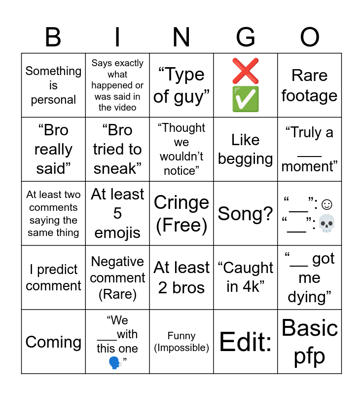 This bingo card has a free space and 24 words: Negative comment (Rare), “We ___with this one 🗣️”, “Thought we wouldn’t notice”, Coming, Rare footage, Something is personal, “Bro really said”, Says exactly what happened or was said in the video, Song?, At least 2 bros, Like begging, At least two comments saying the same thing, “Caught in 4k”, “__ got me dying”, “Bro tried to sneak”, Edit:, “__”:☺️ “__”:💀, “Type of guy”, “Truly a ___ moment”, At least 5 emojis, Basic pfp, I predict comment, ❌ ✅ and Funny (Impossible).