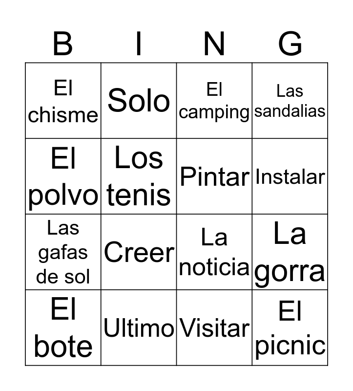 This bingo card has a free space and 15 words: El bote, El picnic, El camping, El chisme, Instalar, El polvo, Creer, Visitar, Los tenis, Las gafas de sol, La gorra, Las sandalias, Pintar, Solo and Ultimo.
