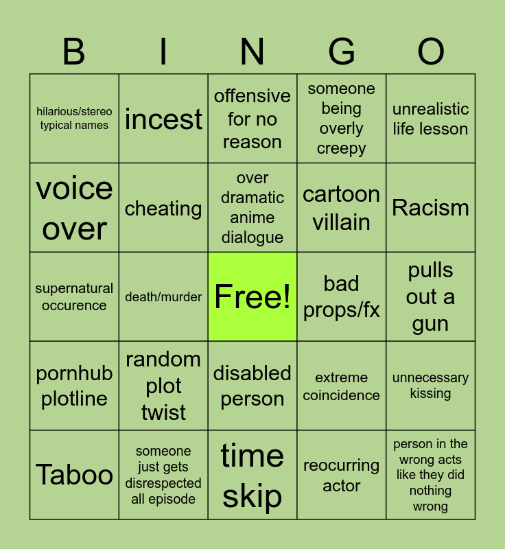 This bingo card has a free space and 24 words: random plot twist, someone just gets disrespected all episode, over dramatic anime dialogue, Taboo, unrealistic life lesson, hilarious/stereo typical names, voice over, incest, bad props/fx, disabled person, cartoon villain, supernatural occurence, extreme coincidence, unnecessary kissing, cheating, reocurring actor, pulls out a gun, offensive for no reason, Racism, death/murder, person in the wrong acts like they did nothing wrong, pornhub plotline, someone being overly creepy and time skip.