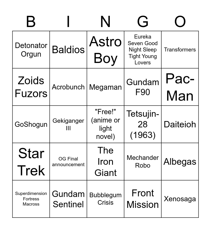 This bingo card has a free space and 24 words: OG Final announcement, Gundam Sentinel, Megaman, Superdimension Fortress Macross, Transformers, Detonator Orgun, Zoids Fuzors, Baldios, Tetsujin-28 (1963), The Iron Giant, Gundam F90, GoShogun, Mechander Robo, Albegas, Acrobunch, Front Mission, Daiteioh, Astro Boy, Pac-Man, Gekiganger III, Xenosaga, Star Trek, Eureka Seven Good Night Sleep Tight Young Lovers and Bubblegum Crisis.