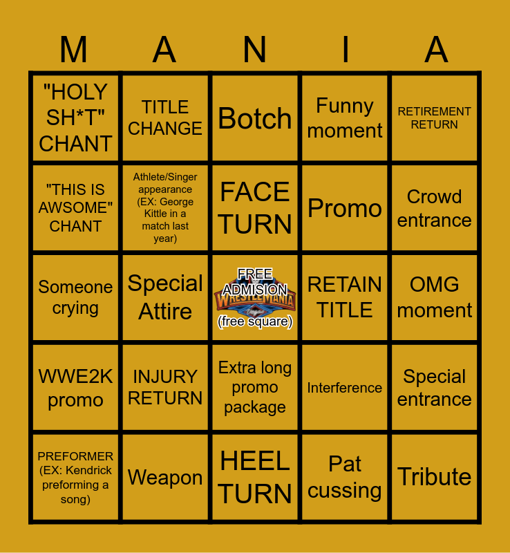 This bingo card has a free space and 25 words: INJURY RETURN, HEEL TURN, FACE TURN, PREFORMER (EX: Kendrick preforming a song), RETIREMENT RETURN, "HOLY SH*T" CHANT, "THIS IS AWSOME" CHANT, TITLE CHANGE, RETAIN TITLE, Extra long promo package, Promo, Someone crying, Interference, Special entrance, Athlete/Singer appearance (EX: George Kittle in a match last year), "This is boring" chant, OMG moment, Botch, Crowd entrance, Special Attire, Tribute, Weapon, WWE2K promo, Funny moment and Pat cussing.