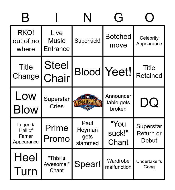 This bingo card has a free space and 24 words: Prime Promo, "This Is Awesome!" Chant, Blood, Heel Turn, Celebrity Appearance, RKO! out of no where, Title Change, Live Music Entrance, Announcer table gets broken, Paul Heyman gets slammed, Yeet!, Low Blow, "You suck!" Chant, Superstar Return or Debut, Steel Chair, Wardrobe malfunction, DQ, Superkick!, Title Retained, Superstar Cries, Undertaker's Gong, Legend/ Hall of Famer Appearance, Botched move and Spear!.