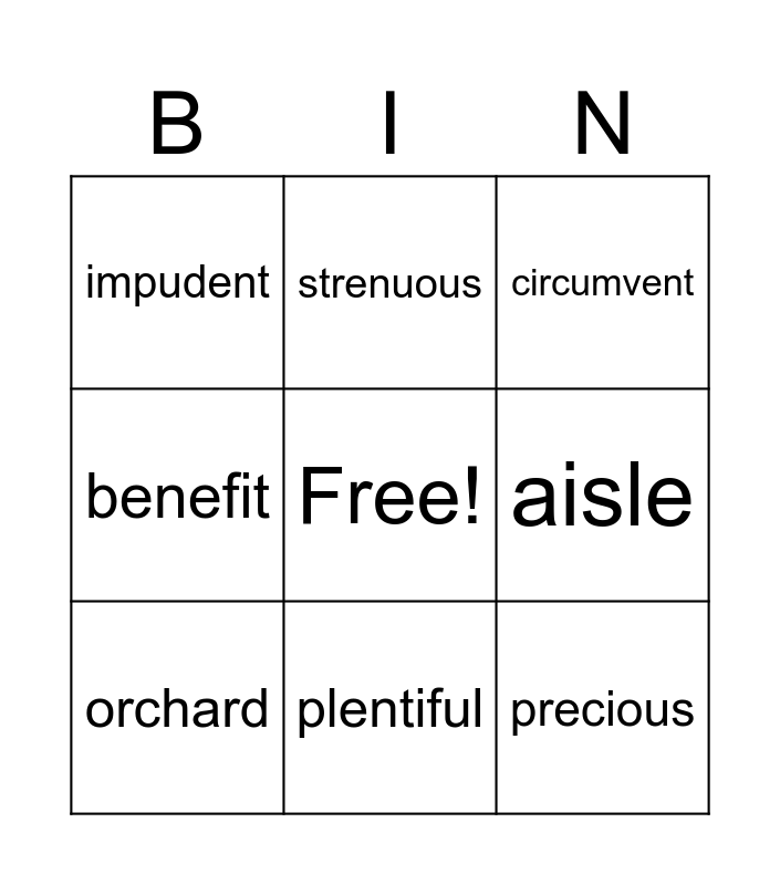 This bingo card has a free space and 8 words: aisle, circumvent, strenuous, orchard, impudent, precious, benefit and plentiful.