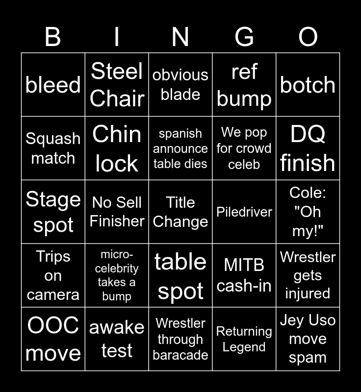 This bingo card has a free space and 24 words: micro-celebrity takes a bump, awake test, spanish announce table dies, OOC move, botch, bleed, Squash match, Steel Chair, Piledriver, table spot, We pop for crowd celeb, Stage spot, MITB cash-in, Wrestler gets injured, Chin lock, Returning Legend, Cole: "Oh my!", obvious blade, DQ finish, No Sell Finisher, Jey Uso move spam, Trips on camera, ref bump and Wrestler through baracade.