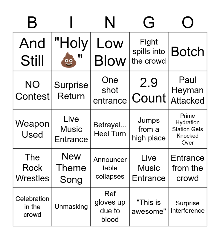 This bingo card has 30 words: Unmasking, Ref Knocked Out, Live Music Entrance, And New, And Still, Low Blow, Surprise Return, Announcer table collapses, Jumps from a high place, Ref gloves up due to blood, Prime Hydration Station Gets Knocked Over, Betrayal... Heel Turn, "This is awesome", Surprise Interference, Paul Heyman Attacked, Wrestler Uses Opponent's Finisher, Live Music Entrance, The Rock Wrestles, New Theme Song, Botch, Weapon Used, 2 or more celebrities sitting next to each other, "Holy 💩", 2.9 Count, NO Contest, Fight spills into the crowd, Entrance from the crowd, Celebration in the crowd, One shot entrance and More than 5 drone shots.