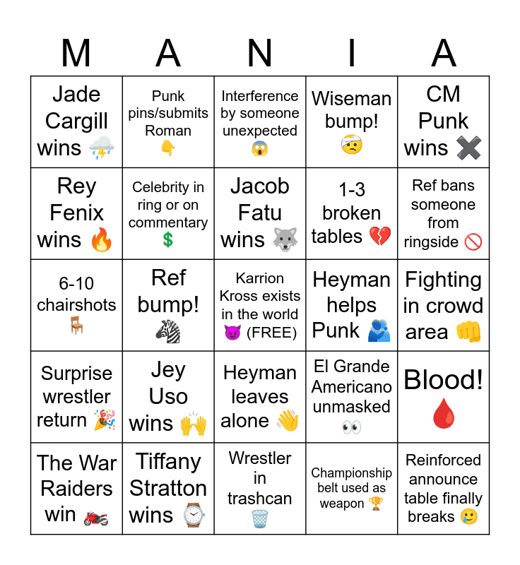 This bingo card has a free space and 24 words: Jey Uso wins 🙌, Tiffany Stratton wins ⌚, Jacob Fatu wins 🐺, The War Raiders win 🏍️, CM Punk wins ✖️, Jade Cargill wins ⛈️, Rey Fenix wins 🔥, Punk pins/submits Roman 👇, Heyman helps Punk 🫂, Heyman leaves alone 👋, 1-3 broken tables 💔, 6-10 chairshots 🪑, El Grande Americano unmasked 👀, Blood! 🩸, Celebrity in ring or on commentary 💲, Championship belt used as weapon 🏆, Fighting in crowd area 👊, Interference by someone unexpected 😱, Ref bans someone from ringside 🚫, Ref bump! 🦓, Reinforced announce table finally breaks 🥲, Surprise wrestler return 🎉, Wiseman bump! 🤕 and Wrestler in trashcan 🗑️.