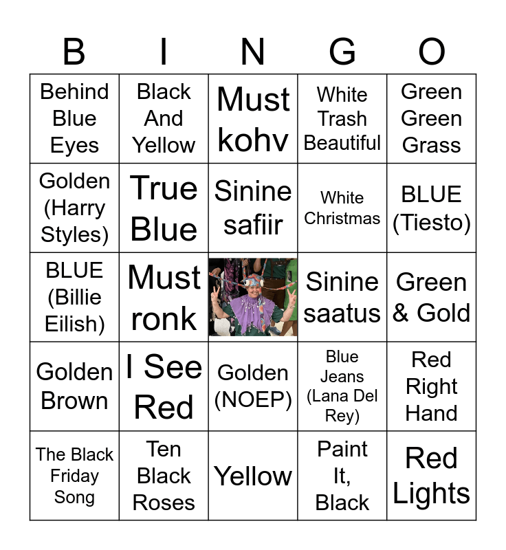 This bingo card has a free space and 71 words: Black Friday, Black And Yellow, The Lady In Red, White Flag, Yellow, Yellow Submarine, White Trash Beautiful, White America, White Christmas, Pretty Fly (For A White Guy), The Black Friday Song, Blue (Da Ba Dee), BLUE (Tiesto), Behind Blue Eyes, Bluey Theme Tune, BLUE (Billie Eilish), Blue Jeans (Lana Del Rey), Green Green Grass, Greenlight, Green & Gold, I See Red, Red Lights, Red Right Hand, Pink, Pink Pony Club, The Pink Panther Theme, Purple Rain, Welcome To The Black Parade, Supermassive Black Hole, Black Widow, Ten Black Roses, Black Or White, Back In Black, Blackbird, Paint It, Black, All Black, Man In Black, Gold Dust, Golden (Harry Styles), Gold Digger, Golden (NOEP), Gold, Golden Brown, Brown Eyes, Purple Haze, Paint The Town Red, Fields Of Gold, True Blue, Behind These Hazel Eyes, Little Red Corvette, Blue Jean (David Bowie), Orange Crush, Sinine saatus, Sinine vilkur, Sinine vagun, Valge mersu, Sinine safiir, Valge Nissan, Valged ööd, Rohelised niidud, Vilkuvad kollased, Musta maagia jõud, Must ronk, Mustad purjed, Must hunt, Must lind, Must kohv, Roosade prillide killud, Kollane päev, Hall Maailm and Black Velvet.