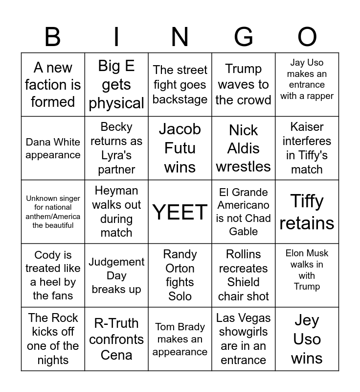 This bingo card has a free space and 29 words: The Rock kicks off one of the nights, The ring collapses, Heyman walks out during match, Lesnar returns, A new faction is formed, The street fight goes backstage, Becky returns as Lyra's partner, Judgement Day breaks up, El Grande Americano is not Chad Gable, R-Truth confronts Cena, Tiffy retains, Jey Uso wins, Tom Brady makes an appearance, Las Vegas showgirls are in an entrance, Kaiser interferes in Tiffy's match, Logan Paul drinks a Prime, Randy Orton fights Solo, Cody is treated like a heel by the fans, Jay Uso makes an entrance with a rapper, Unknown singer for national anthem/America the beautiful, Rollins recreates Shield chair shot, The Rock interferes in Cena vs Cody, Nick Aldis wrestles, Dana White appearance, Trump waves to the crowd, Big E gets physical, Elon Musk walks in with Trump, Jacob Futu wins and Orton fights someone new.