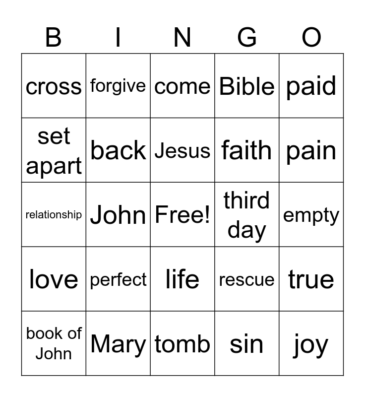 This bingo card has a free space and 30 words: Mary, Peter, John, die, cross, come, back, life, third day, tomb, empty, joy, sin, brokenness, pain, death, rescue, love, perfect, paid, relationship, save, forgive, faith, set apart, Bible, true, book of John, Jesus and God’s Son.