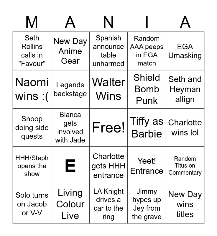 This bingo card has a free space and 24 words: E, Living Colour Live, Walter Wins, Solo turns on Jacob or V-V, EGA Umasking, Seth Rollins calls in "Favour", Naomi wins :(, New Day Anime Gear, Tiffy as Barbie, Charlotte gets HHH entrance, Shield Bomb Punk, Snoop doing side quests, Yeet! Entrance, Random Titus on Commentary, Legends backstage, Jimmy hypes up Jey from the grave, Charlotte wins lol, Spanish announce table unharmed, Seth and Heyman allign, Bianca gets involved with Jade, New Day wins titles, HHH/Steph opens the show, Random AAA peeps in EGA match and LA Knight drives a car to the ring.