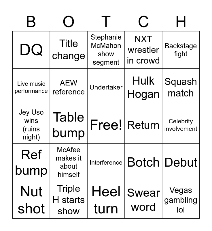 This bingo card has a free space and 24 words: McAfee makes it about himself, Triple H starts show, Undertaker, Nut shot, Backstage fight, DQ, Live music performance, Title change, Return, Interference, Hulk Hogan, Jey Uso wins (ruins night), Botch, Debut, AEW reference, Swear word, Celebrity involvement, Stephanie McMahon show segment, Squash match, Table bump, Vegas gambling lol, Ref bump, NXT wrestler in crowd and Heel turn.