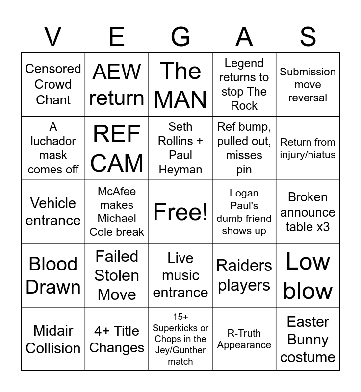 This bingo card has a free space and 24 words: Failed Stolen Move, 4+ Title Changes, Seth Rollins + Paul Heyman, Midair Collision, Submission move reversal, Censored Crowd Chant, A luchador mask comes off, AEW return, Logan Paul's dumb friend shows up, Live music entrance, Ref bump, pulled out, misses pin, Vehicle entrance, Raiders players, Low blow, REF CAM, R-Truth Appearance, Broken announce table x3, The MAN, Return from injury/hiatus, McAfee makes Michael Cole break, Easter Bunny costume, Blood Drawn, Legend returns to stop The Rock and 15+ Superkicks or Chops in the Jey/Gunther match.