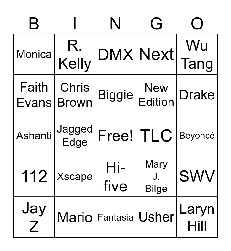 This bingo card has a free space and 24 words: Xscape, Mario, Biggie, Jay Z, Wu Tang, Monica, Faith Evans, R. Kelly, TLC, Hi-five, New Edition, Ashanti, Mary J. Bilge, SWV, Chris Brown, Usher, Beyoncé, DMX, Drake, Jagged Edge, Laryn Hill, 112, Next and Fantasia.
