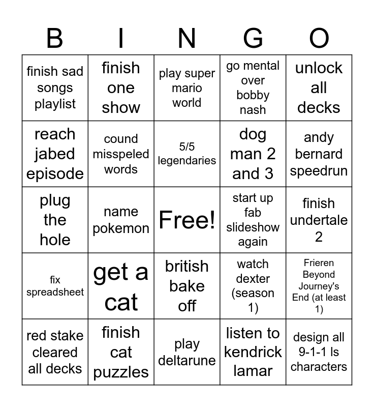 This bingo card has a free space and 24 words: get a cat, finish cat puzzles, 5/5 legendaries, red stake cleared all decks, unlock all decks, finish sad songs playlist, reach jabed episode, finish one show, start up fab slideshow again, british bake off, dog man 2 and 3, plug the hole, watch dexter (season 1), Frieren Beyond Journey's End (at least 1), cound misspeled words, listen to kendrick lamar, finish undertale 2, play super mario world, andy bernard speedrun, name pokemon, design all 9-1-1 ls characters, fix spreadsheet, go mental over bobby nash and play deltarune.