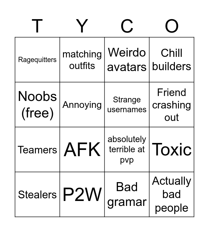 This bingo card has 16 words: P2W, Toxic, Weirdo avatars, Ragequitters, Teamers, matching outfits, absolutely terrible at pvp, Bad gramar, Noobs (free), Annoying, Stealers, Chill builders, AFK, Friend crashing out, Strange usernames and Actually bad people.