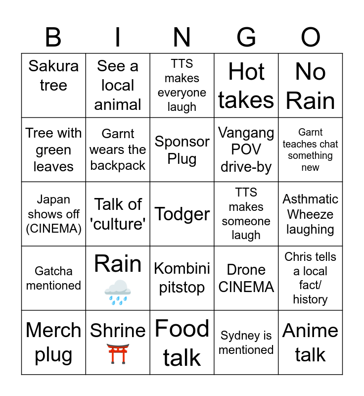 This bingo card has a free space and 24 words: Rain 🌧️, Shrine ⛩️, Sponsor Plug, Merch plug, No Rain, Sakura tree, Tree with green leaves, See a local animal, TTS makes someone laugh, Kombini pitstop, Vangang POV drive-by, Japan shows off (CINEMA), Drone CINEMA, Chris tells a local fact/ history, Garnt wears the backpack, Sydney is mentioned, Asthmatic Wheeze laughing, TTS makes everyone laugh, Garnt teaches chat something new, Talk of 'culture', Anime talk, Gatcha mentioned, Hot takes and Food talk.