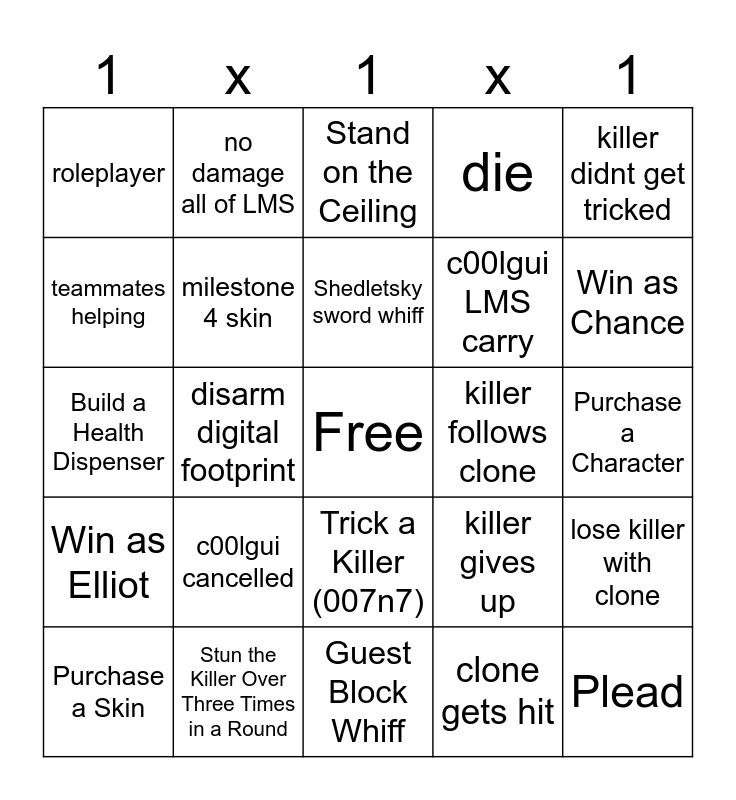 This bingo card has a free space and 48 words: c00lgui escape, Plead, Chance Gun Whiff, Guest Block Whiff, c00lgui cancelled, clone parry, no damage all of LMS, clone parry fail, teammates helping, no damage taken, milestone 4 skin, die, lose killer with clone, killer gives up, killer doesnt get tricked, fake clone working, Shedletsky sword whiff, killer follows clone, no inject usage, killer didnt get tricked, disarm digital footprint, clone gets hit, roleplayer, c00lgui LMS carry, Obtain Weakness X or Higher, Win as Chance, Purchase a Skin, Win as 007n7, Trick a Killer (007n7), Win as Elliot, Become Killer, Obtain Over 1K+ Points, Win as Killer, Stun a Killer, Stun the Killer Over Three Times in a Round, Juke a Killer, Win as Builderman, Purchase a Character, Win as 1x1x1x1, Use Rush Hour, Talk to Glebus, Survive 1x1x1x1, Stand on the Ceiling, Win as Guest 1337, Build a Health Dispenser, Shank a Killer, Win as Two Time and Win as a Survivor with Under 20 Health.