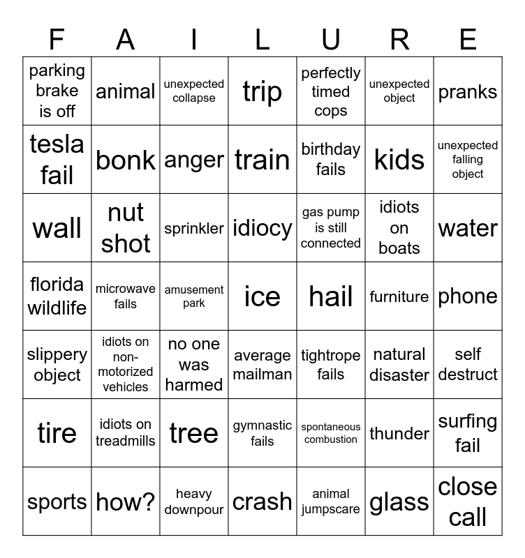 This bingo card has 71 words: not a fail, animal, slip, self destruct, microwave fails, idiots in motorized land vehicles, trip, how?, bonk, fire, water, glass, anger, parking brake is off, poor quality, train, gas pump is still connected, perfectly timed cops, crash, wall, sprinkler, kids, idiots on boats, phone, no one was harmed, thunder, tree, spontaneous combustion, average mailman, sports, florida wildlife, animal jumpscare, trampoline, waterpark, amusement park, natural disaster, close call, blindfold, unexpected object, idiots on non-motorized vehicles, idiocy, ice, nut shot, cooking, not sturdy, slippery object, surfing fail, pranks, gym fail, tire, pool, appliance fail, unexpected falling object, hail, heavy downpour, fish, tesla fail, electrical fail, idiots on treadmills, idiots on swings, arcade, snowboarding fails, birthday fails, expensive fails, gymnastic fails, tightrope fails, unexpected collapse, farm, vr, furniture and no one was harmed when someone was harmed.