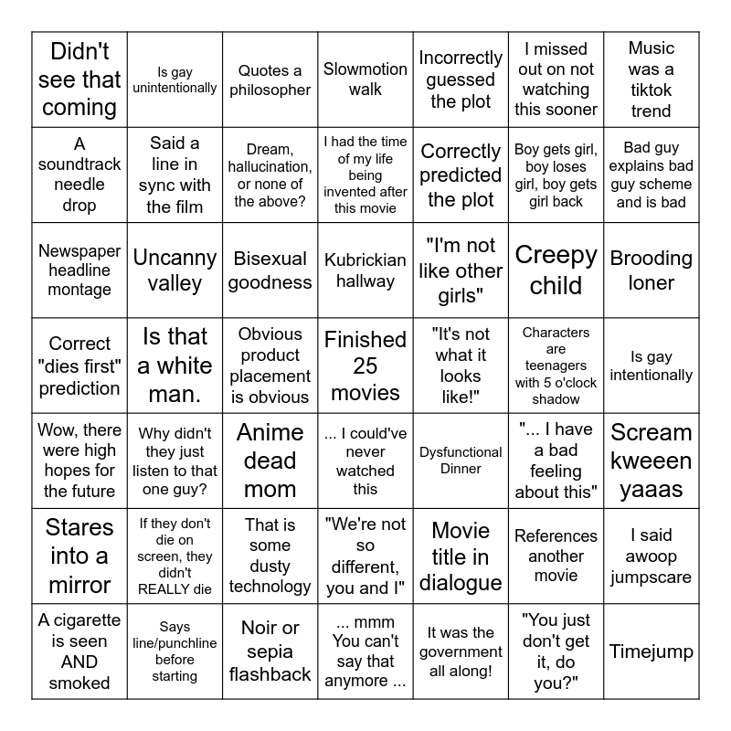 This bingo card has a free space and 48 words: Movie title in dialogue, Boy gets girl, boy loses girl, boy gets girl back, ... mmm You can't say that anymore ..., Is that a white man., Bisexual goodness, Is gay intentionally, Is gay unintentionally, Says line/punchline before starting, I missed out on not watching this sooner, ... I could've never watched this, Music was a tiktok trend, Slowmotion walk, Creepy child, "I'm not like other girls", Stares into a mirror, Characters are teenagers with 5 o'clock shadow, A soundtrack needle drop, Bad guy explains bad guy scheme and is bad, References another movie, Incorrectly guessed the plot, Correctly predicted the plot, Obvious product placement is obvious, Didn't see that coming, Said a line in sync with the film, I said awoop jumpscare, Dream, hallucination, or none of the above?, Brooding loner, A cigarette is seen AND smoked, Kubrickian hallway, Uncanny valley, "You just don't get it, do you?", "It's not what it looks like!", Scream kweeen yaaas, If they don't die on screen, they didn't REALLY die, Correct "dies first" prediction, Dysfunctional Dinner, "... I have a bad feeling about this", Newspaper headline montage, Anime dead mom, That is some dusty technology, Wow, there were high hopes for the future, Timejump, Quotes a philosopher, Noir or sepia flashback, I had the time of my life being invented after this movie, "We're not so different, you and I", Why didn't they just listen to that one guy? and It was the government all along!.
