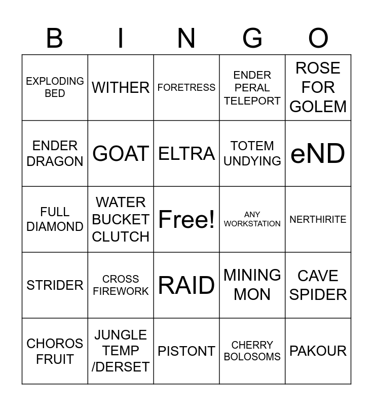 This bingo card has a free space and 24 words: CROSS FIREWORK, JUNGLE TEMP /DERSET, ELTRA, CHOROS FRUIT, ROSE FOR GOLEM, EXPLODING BED, ENDER DRAGON, WITHER, ANY WORKSTATION, RAID, TOTEM UNDYING, FULL DIAMOND, MINING MON, CAVE SPIDER, GOAT, CHERRY BOLOSOMS, NERTHIRITE, FORETRESS, eND, WATER BUCKET CLUTCH, PAKOUR, STRIDER, ENDER PERAL TELEPORT and PISTONT.