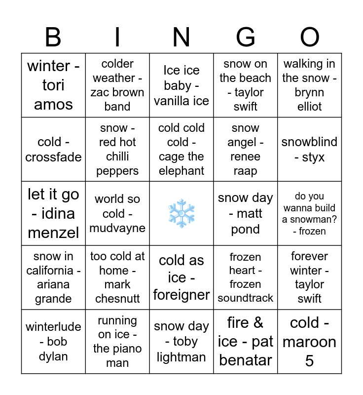 This bingo card has a free space and 27 words: frozen heart - frozen soundtrack, cold as you - taylor swift, snow angel - renee raap, snow day - toby lightman, cold - crossfade, Ice ice baby - vanilla ice, colder weather - zac brown band, snow in california - ariana grande, snow day - matt pond, forever winter - taylor swift, let it go - idina menzel, snow on the beach - taylor swift, winterlude - bob dylan, running on ice - the piano man, snowblind - styx, stone cold classic - AKA george, snow - red hot chilli peppers, cold cold cold - cage the elephant, too cold at home - mark chesnutt, winter - tori amos, do you wanna build a snowman? - frozen, fire & ice - pat benatar, world so cold - mudvayne, cold - maroon 5, cold as ice - foreigner, walking in the snow - brynn elliot and shiver - coldplay.