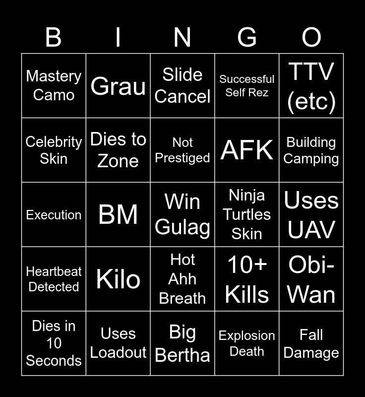 This bingo card has a free space and 29 words: Dies in 10 Seconds, Snipe Kill, BM, Stimmy Check, Mastery Camo, Slide Cancel, Dies to Zone, Kilo, Ninja Turtles Skin, Uses Loadout, Uses UAV, Fall Damage, Big Bertha, Explosion Death, Building Camping, Vehicle Spatter, Hot Ahh Breath, Heartbeat Detected, TTV (etc), Execution, 10+ Kills, Drop Shot, AFK, Celebrity Skin, Successful Self Rez, Grau, Obi-Wan, Not Prestiged and Dies With 0 Kills.