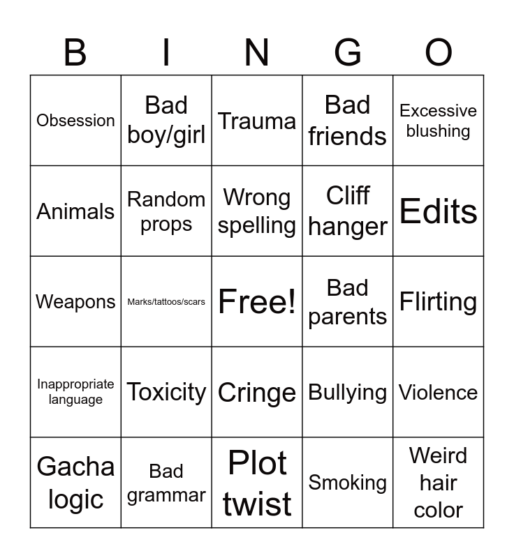 This bingo card has a free space and 24 words: Toxicity, Bad grammar, Wrong spelling, Gacha logic, Excessive blushing, Obsession, Animals, Bad boy/girl, Bad parents, Cringe, Cliff hanger, Weapons, Bullying, Violence, Random props, Smoking, Flirting, Trauma, Edits, Marks/tattoos/scars, Weird hair color, Inappropriate language, Bad friends and Plot twist.