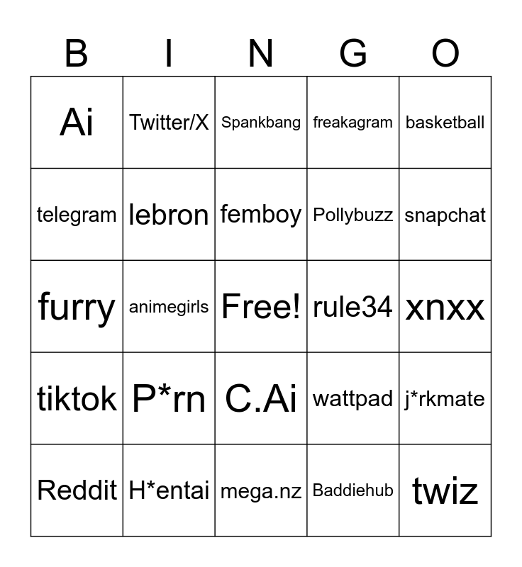 This bingo card has a free space and 24 words: P*rn, H*entai, femboy, Reddit, basketball, Ai, telegram, Twitter/X, rule34, C.Ai, Pollybuzz, furry, wattpad, j*rkmate, lebron, Baddiehub, xnxx, Spankbang, snapchat, animegirls, twiz, tiktok, freakagram and mega.nz.