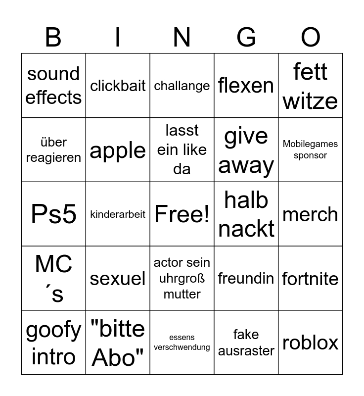 This bingo card has a free space and 24 words: sexuel, "bitte Abo", lasst ein like da, goofy intro, fett witze, sound effects, über reagieren, clickbait, halb nackt, actor sein uhrgroß mutter, give away, Ps5, freundin, fortnite, apple, fake ausraster, merch, challange, Mobilegames sponsor, kinderarbeit, roblox, MC´s, flexen and essens verschwendung.