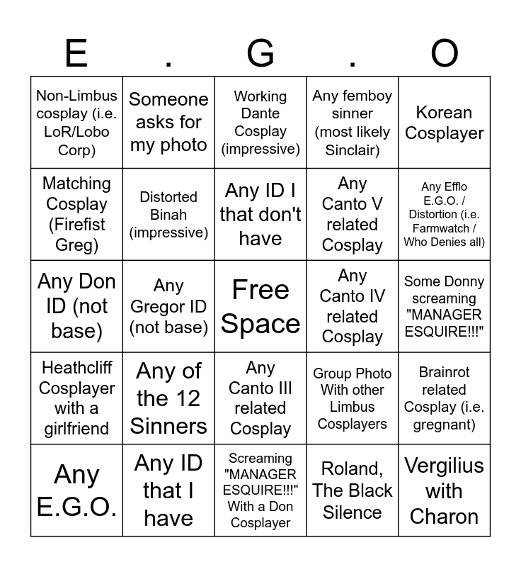 This bingo card has a free space and 24 words: Any of the 12 Sinners, Any ID that I have, Any ID I that don't have, Any E.G.O., Korean Cosplayer, Non-Limbus cosplay (i.e. LoR/Lobo Corp), Matching Cosplay (Firefist Greg), Someone asks for my photo, Any Canto IV related Cosplay, Any Canto III related Cosplay, Any Canto V related Cosplay, Any Don ID (not base), Group Photo With other Limbus Cosplayers, Brainrot related Cosplay (i.e. gregnant), Distorted Binah (impressive), Roland, The Black Silence, Some Donny screaming "MANAGER ESQUIRE!!!", Working Dante Cosplay (impressive), Any Efflo E.G.O. / Distortion (i.e. Farmwatch / Who Denies all), Any Gregor ID (not base), Vergilius with Charon, Heathcliff Cosplayer with a girlfriend, Any femboy sinner (most likely Sinclair) and Screaming "MANAGER ESQUIRE!!!" With a Don Cosplayer.