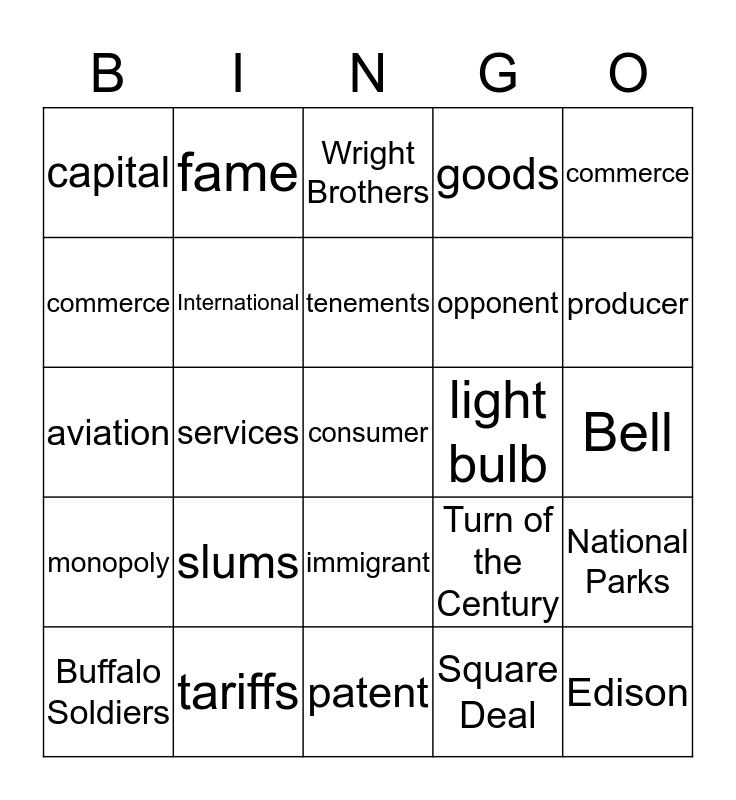 This bingo card has 25 words: slums, patent, tenements, Buffalo Soldiers, commerce, capital, commerce, fame, light bulb, immigrant, opponent, aviation, Turn of the Century, National Parks, International, Edison, Bell, Wright Brothers, producer, services, consumer, tariffs, monopoly, goods and Square Deal.